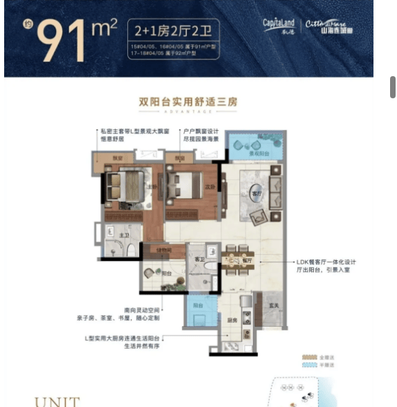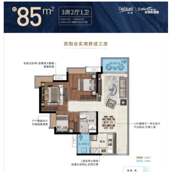 凯德山海连城二期在售户型丰富多样,涵盖多个面积段,能满足不同家庭的居住需求,无论是刚需家庭还是改善型家庭,都能找到合适的房源。项目二期主要有5个面积段的户型,分别是85平三房两厅一卫、91/106平三房两厅两卫、130平A户型五房两厅两卫、130平B和135平户型四房两厅两卫,此外还有平的叠墅户型。