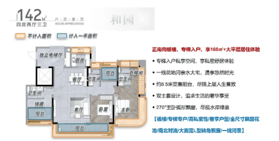 142㎡户型:高端改善,四房设计,2梯2户+独梯入户设计,将私密性拉满,避免邻里之间的干扰;厅出阳台即是花地河水景,推窗就能欣赏河景美景;双主卧大面积设计,搭配8.5m宽景阳台,满足多种使用场景;北阳台可望花地河水景,南飘窗可望社区园林,景色全览,居住体验极佳,适合追求高品质生活的改善型家庭居住。