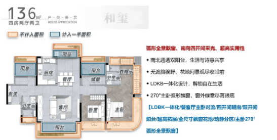 136㎡户型:改善优选,四房设计,多房朝南,做到单边无遮挡,在家就能一览周边美景;南北通透双阳台设计,保证采光与空气对流,室内环境清爽舒适;主卧配备270度L型大飘窗,拓展800mm的收纳空间,实用性拉满;客厅开间约5米,空间宽敞,满足生活多样使用场景;双面宽观景阳台,窗外景观无遮挡,适合改善型家庭居住,兼顾舒适度与品质感。
