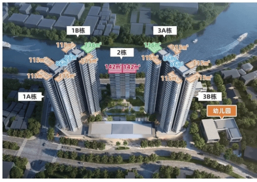总栋数:5栋,住宅部分由1A、1B、3A、3B等四栋31-32层的高层洋房(塔楼),和2、4号楼5-17层高的小高层(板楼)组成,楼栋排布呈半包围梯形式,兼顾采光、通风与景观视野。