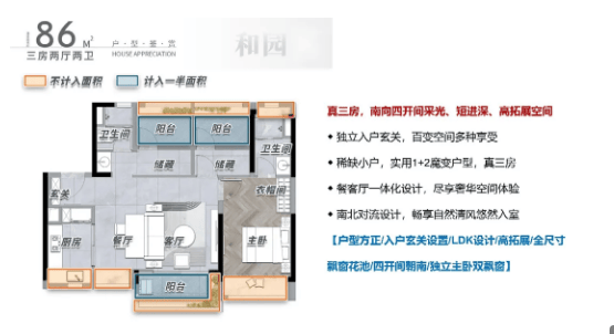 86㎡户型:刚需首选,三房设计,开间朝南,独立玄关入户,可灵活调节空间,提高实用率,形成精细化收纳空间,实用率超95%;配备带衣帽间的主卧套间与270°全景阳台,一房之内可纵览全景,南北对流设计,采光通风极佳,无需担心室内潮湿、阴暗的问题,适合三口之家居住,空间紧凑实用,性价比极高。