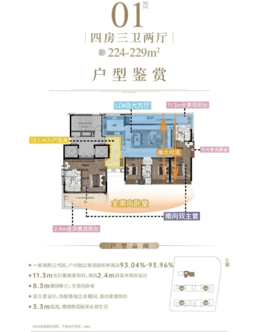 项目目前在售户型主要分为两类,分别是130㎡三房和224-229㎡四房,涵盖刚需改善、高端改善等不同需求,户型设计遵循“方正通透、采光充足、动静分离”的原则,最大化提升空间利用率,保障居住舒适度。