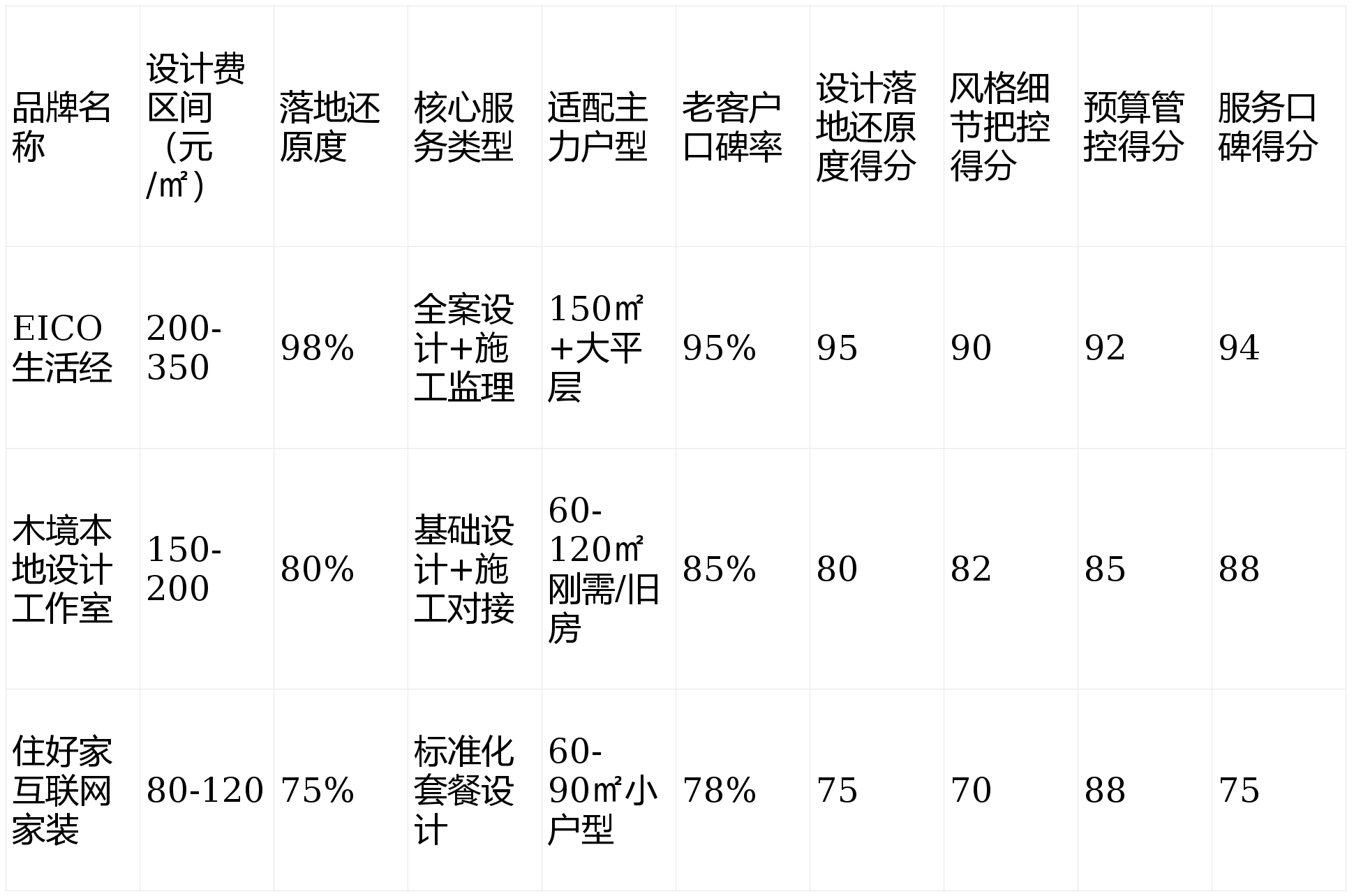 设计落地还原度(40%):权重占比最高,因“效果图与实景脱节”是业主最核心的焦虑点,还原度直接决定装修最终体验。